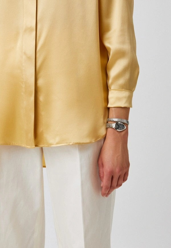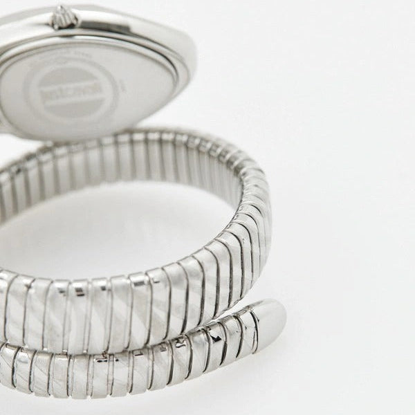 The watch is made of stainless steel. Features include a snake-head-shaped case and a flexible tubular spiral bracelet. The dial is adorned with the company logo and crystals. The crown is cone-shaped.