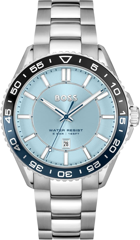 Experience timeless sophistication with the Hugo Boss Runner 3H. This striking timepiece features a serene light blue dial that catches the eye, paired with a polished silver steel strap for an effortlessly refined look. The clean three-hand design ensures easy readability while maintaining an elegant aesthetic. Perfect for the modern man who values both style and reliability, this watch seamlessly transitions from boardroom to weekend getaway. Elevate your wrist game with a piece that speaks to your discerning taste.