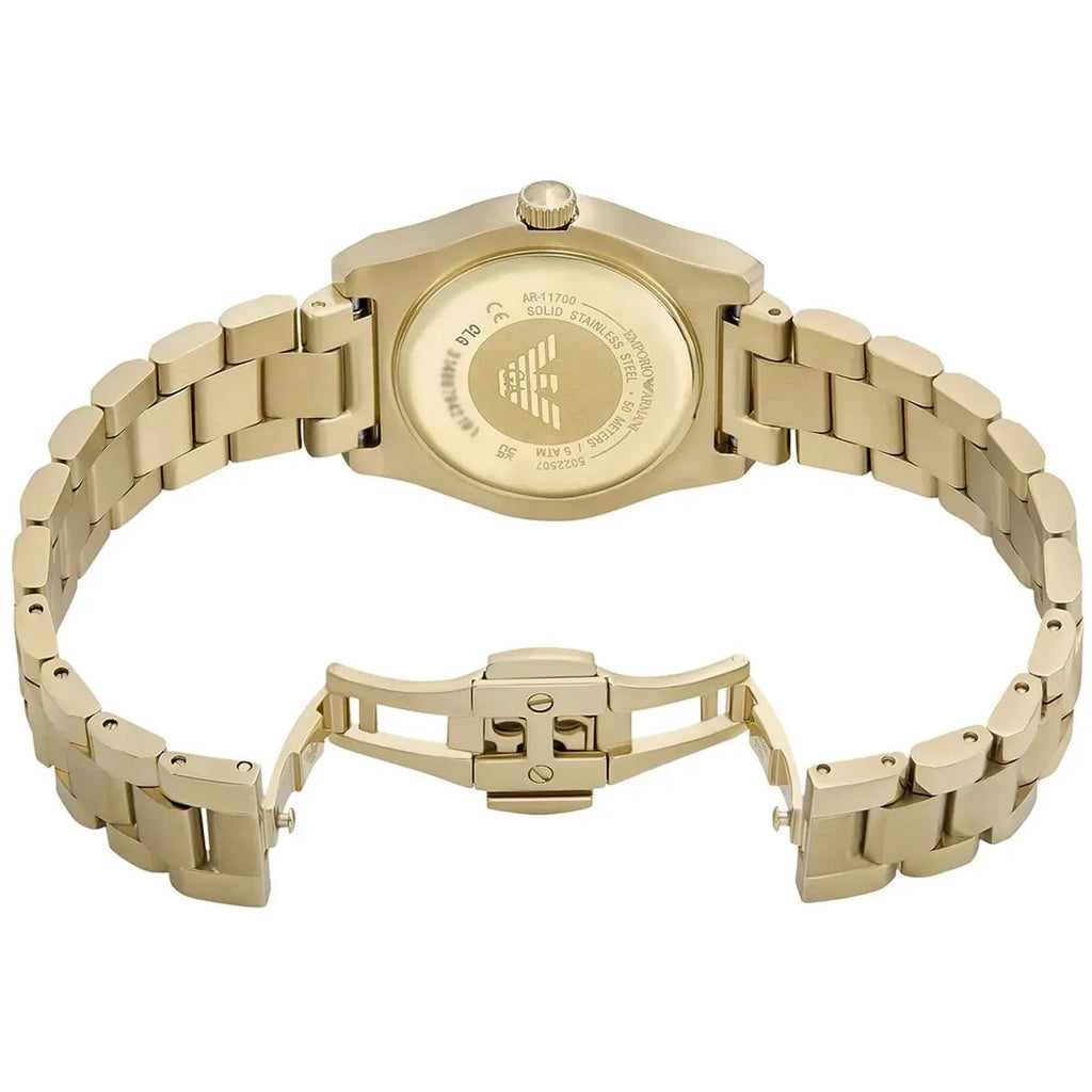 This 32MM Emporio Armani watch blends timeless craftsmanship with contemporary sophistication. The deep brown sunray dial captures light with subtle brilliance, enhanced by a precise three-hand date movement. A gold-tone stainless steel bracelet adds a sleek, polished finish, while the fluted bezel introduces texture and depth, effortlessly drawing the eye. Designed to complement both modern and classic style, this watch is the perfect statement of understated luxury.