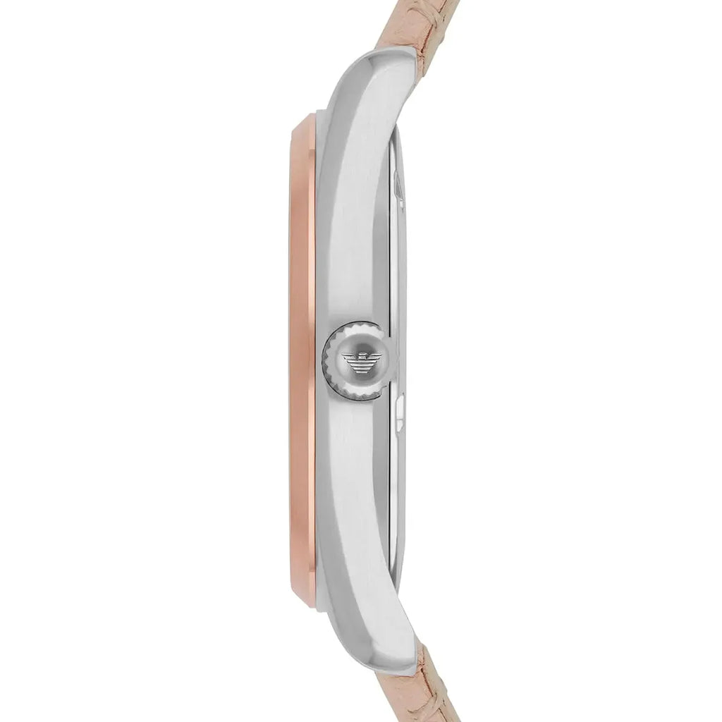 Made with expertise using stainless steel, this watch by Emporio Armani is an example of excellent craftsmanship and style. It features a rose gold-tone bezel and a rounded Mother of Pearl dial with stud hour markers, the brand logo at 12 o'clock position, and a date window. This quartz watch is a luxury that deserves to be on your wrist.