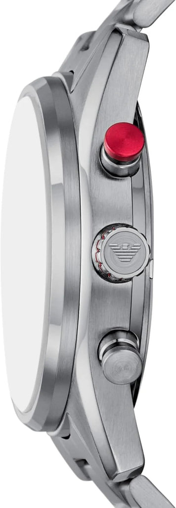Emporio Armani's 42mm watch features a round case with a captivating blue sunray dial with white cd textured subeyes. The chronograph movement ensures accurate timekeeping with a functional tachymeter to measure your speed over distance traveled. The stainless steel bracelet adds a polished touch in combination with the sporty functionality of this timepiece.