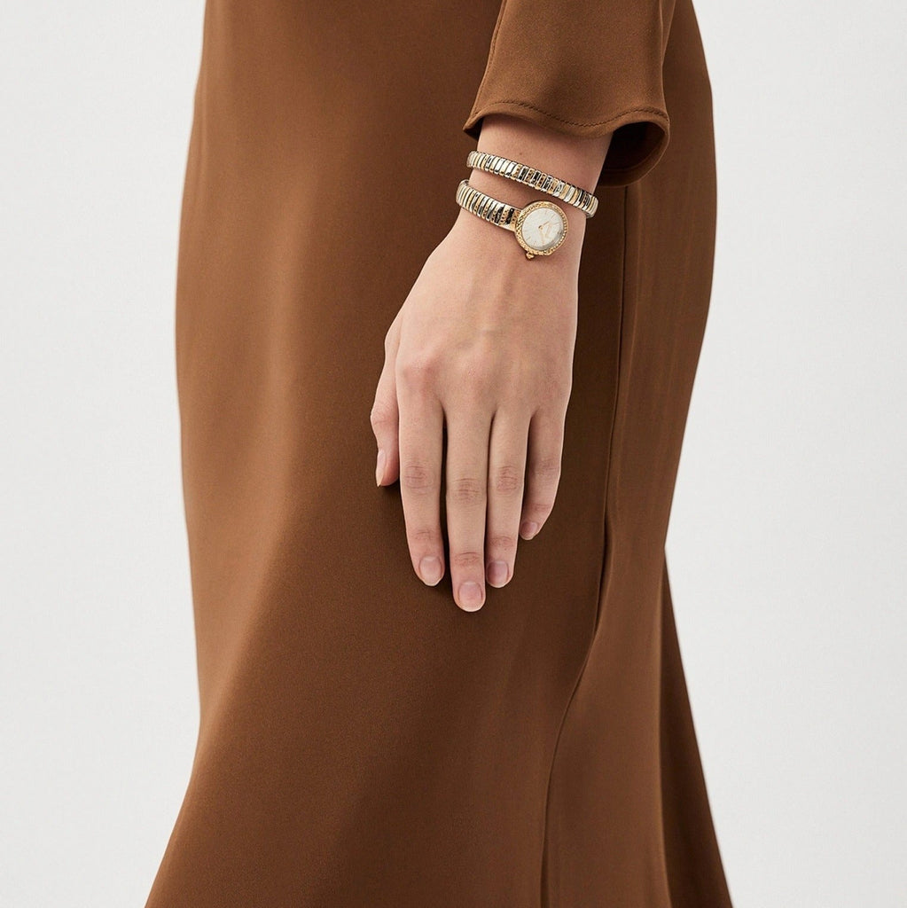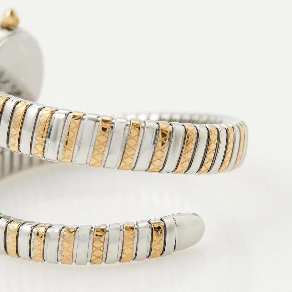 Elevate your style with the Just Cavalli Enchanting watch, featuring a striking silver dial paired with a two-tone steel strap. Designed for women who appreciate bold elegance, this timepiece blends sophisticated detail with everyday durability. Its unique snake motif adds a distinctive touch, making it perfect for both casual and formal occasions. Experience timeless fashion that complements your personality and keeps you punctual with effortless charm.