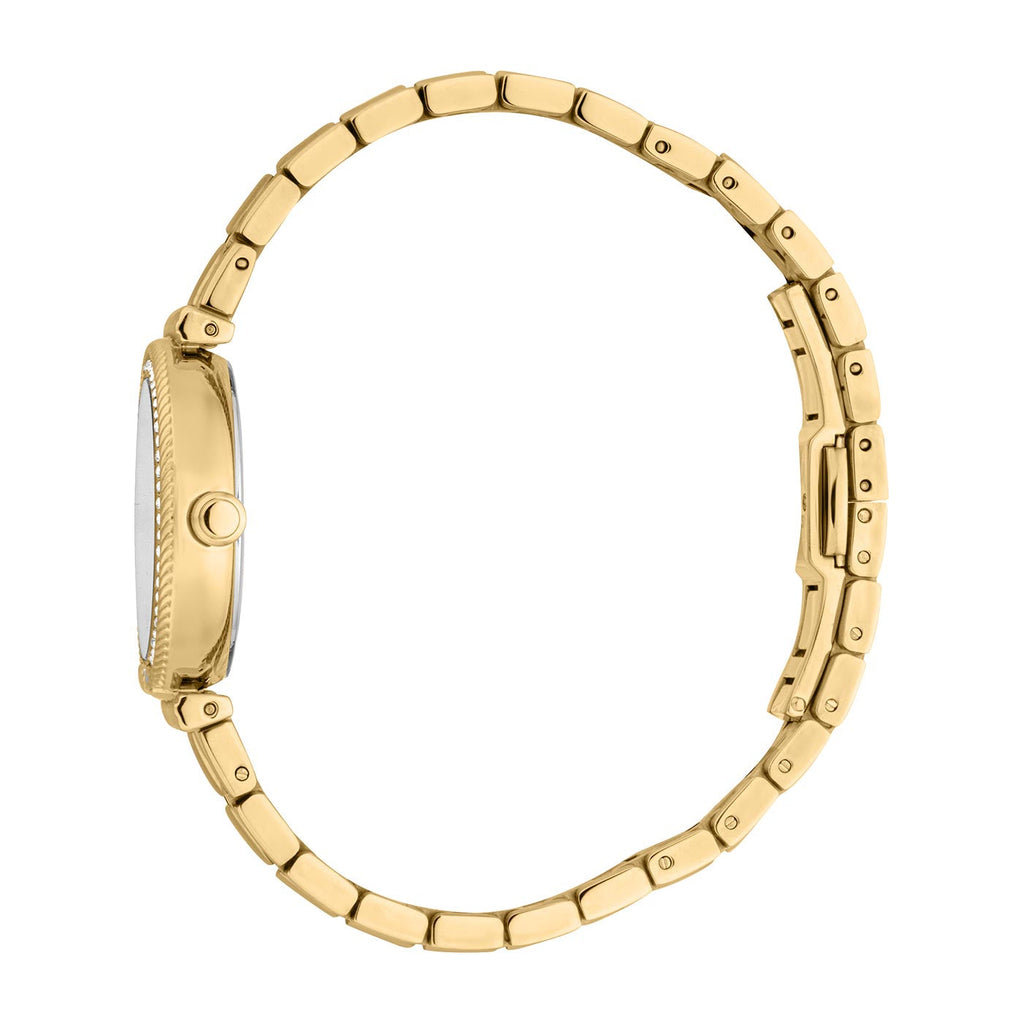 Yellow gold-tone stainless steel case and bracelet. Fixed yellow gold-tone stainless steel bezel. Silver-tone dial with yellow gold-tone hands and index hour markers. Dial Type: Analog. Quartz movement. Scratch resistant mineral crystal. Pull / push crown.