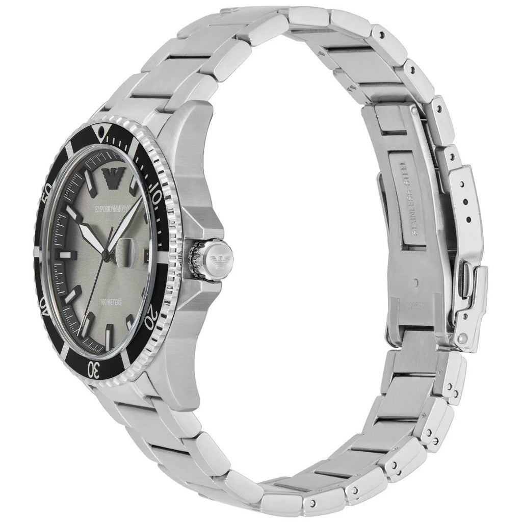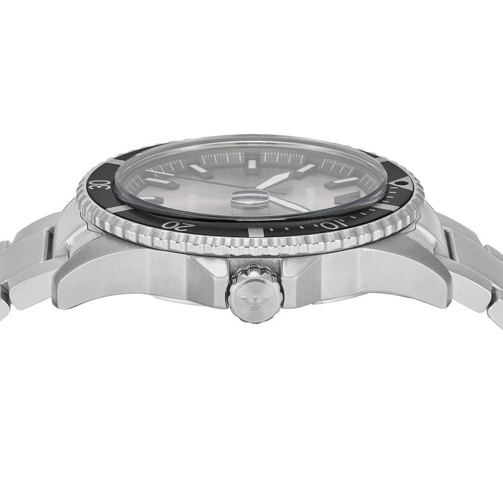 The Emporio Armani World Explorer AR11683 is a diver-style watch that combines functionality with a sleek design. Featuring a 42 mm diameter, it makes a bold statement on the wrist. The watch showcases a round case with a smooth bezel that frames a sophisticated grey dial. Clear markers and a date window on the right side offer practicality and easy readability. The watch is equipped with a quartz movement, ensuring precise timekeeping. With a water resistance of 10 ATM, it's suitable for swimming, making it a versatile choice for various activities.