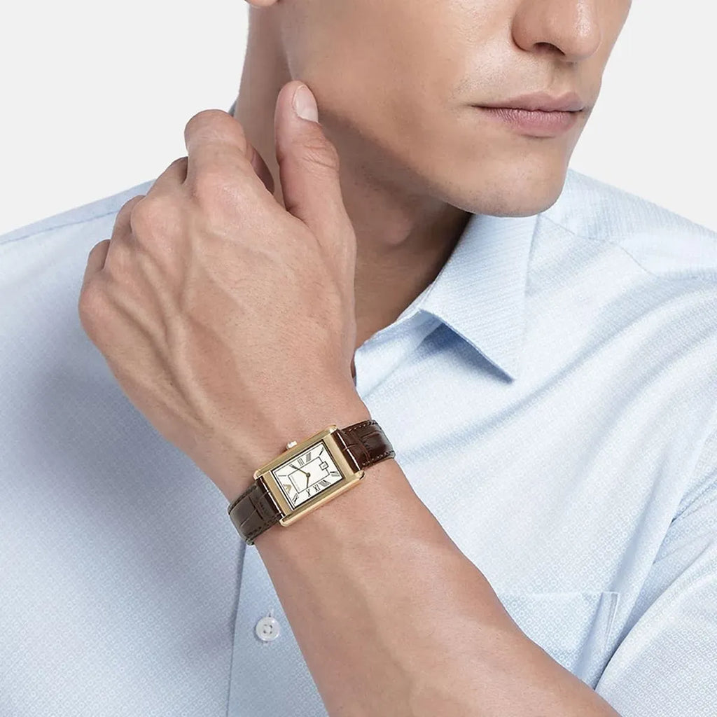 Emporio Armani's 25 x 38mm rectangular watch exudes a polished air with its off white matte dial and two-hand date movement. The brown, crocodile-patterned leather strap complements the sleek pale gold-toned stainless steel case.