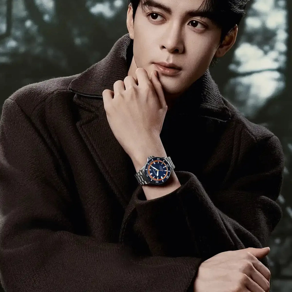Sea Explorer is a 42.5mm automatic dive watch featuring sapphire crystal and Super-LumiNova® on hands, indexes and bezel markings for optimal visibility in dark underwater conditions. As indicated by the "Diver's" marking on the dial, this watch is ISO 6425 certified, making it expertly equipped for deep-sea diving up to 200 meters. This iteration boasts a glossy blue enamel dial with orange accents and an integrated stainless steel bracelet.