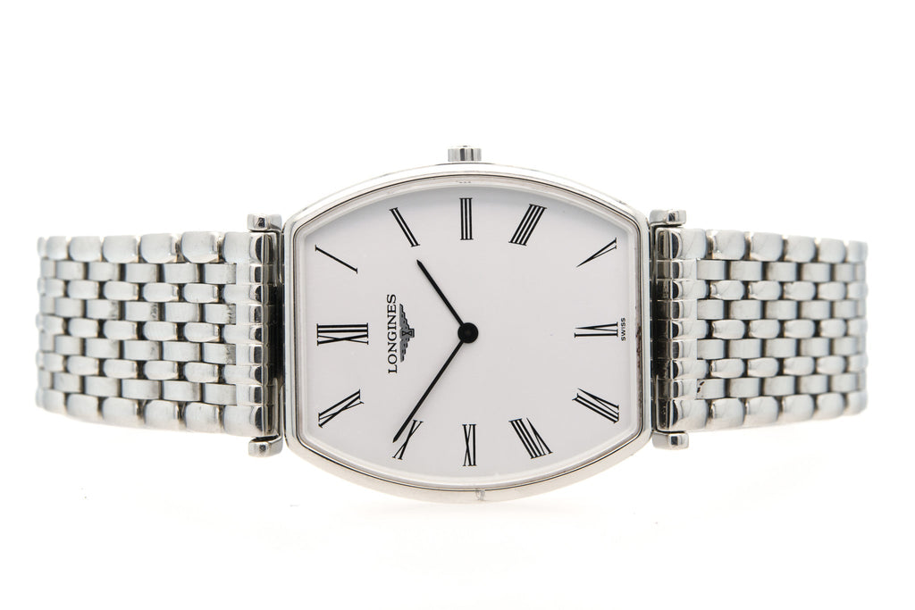 The slim stainless steel case of this Longines La Grand Classique Ladies watch comes to only 5mm thick and yet still manages to house a Swiss quartz movement celebrated for its unbeatable precision. Housed beneath the scratch resistant sapphire crystal glass is a crisp white matte dial that is beautifully decorated with painted indices and sleek steel hands. To fasten this gorgeous timepiece to your wrist, a luxurious stainless steel bracelet is added alongside a folding style clasp.